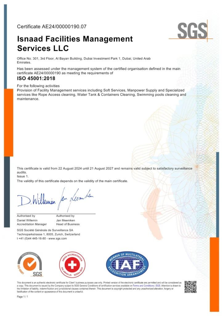 Isnaad has been awarded the Cleaning Industry Management Standard (CIMS) certification. This accreditation confirms that we uphold the highest global cleaning standards for our clients and end-users.
